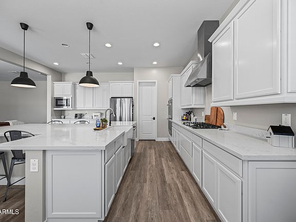 Nestled in the prestigious Gated ESTATES at Eastmark, this exceptional home rests on a premium ¼-acre lot and delivers the perfect blend of luxury, comfort, and thoughtful design. From the moment you arrive, the true 4-car garage, soaring ceilings, and bright, open layout make a remarkable impression. Inside, designer finishes elevate every space — luxury vinyl plank flooring, quartz countertops, custom tile accents, wood shutters, stainless steel appliances, a sprawling T-shaped island, abundant cabinetry, and a spacious walk-in pantry and laundry room. The floor-plan also features a flexible fourth bedroom currently styled as a large den, offering the perfect option for an office, game room, or guest suite — add a door and closet for a full fourth bedroom, or enjoy the openness as-is. The private owner's suite offers a serene retreat with a spa-inspired bathroom, highlighted by a clawfoot soaking tub, oversized custom-tile shower, and dual vanities. Step outside to your own backyard sanctuary, complete with lush landscaping, a manicured lawn, and an expansive covered patio, an ideal setting for entertaining, relaxing, and savoring unforgettable Arizona sunsets. Plenty of room in the large backyard to build the pool of your dreams! Located in one of the East Valley's most sought-after gated communities, residents enjoy resort-style amenities, scenic walking paths, and proximity to top-rated schools, dining, and shopping. Luxury, space, and lifestyle, now offered at an exceptional NEW PRICE.