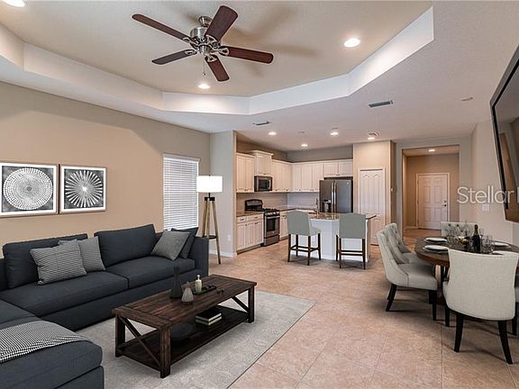 - Interior Features: Ceiling Fans(s), Eating Space In Kitchen, High Ceiling(s), Open Floorplan, Walk-In Closet(s), Thermostat, Kitchen/Family Room Combo, Solid Surface Counters, Window Treatments, Tray Ceiling(s)