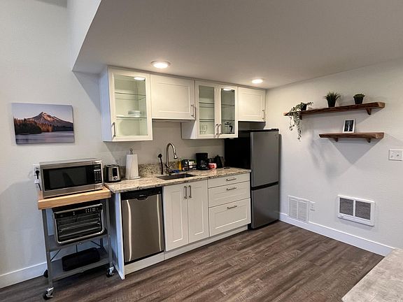 No pets allowed due to allergies. For single occupancy only. Fully Furnished 1BR, 1BA Ground-Floor Unit in Townhouse - Ideal for Busy Professionals! This private living space offers complete autonomy with a separate entrance. Features include shared backyard, washer/dryer, and brand new appliances. Front door has keypad entry lock. Ample storage space for bikes and other items. Living room has a 50" flat-screen TV and a comfortable leather couch. Kitchenette is well-equipped with new modern appliances: Large Fridge/Freezer, Dishwasher, Disposal, Microwave, XL Air Fryer, & Induction Cooktop (no conventional oven/stovetop). Located in a safe, quiet neighborhood within walking distance of essentials like QFC, Starbucks, Providence Hospital, Tabor Tavern, and scenic Laurelhurst and Mount Tabor parks. With a Walk Score of 85 and a Bike Score of 87, exploring the area is easy! Commute to downtown in: Car: 8 min Bike: 19 min Bus: 23 min MAX: 25 min Utilities & High Speed Wifi will be split 50/50 with the tenant in the separate upstairs unit. No pets. Single occupancy only. No smoking. Street parking. Renters insurance required.