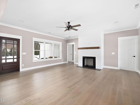 As you arrive, you'll find ample parking on the concrete driveway with additional parking pad/turn around area, leading to the two car garage. Following the side walk, you will be warmly greeted by a covered front porch that is an excellent space to unwind and catch a glimpse of the mountains in the distance. Just past the front door with beveled glass details, an inviting and beautifully finished interior awaits! This floor plan, featuring warm neutral paint throughout, is both open and airy, while offering thoughtful, dedicated spaces. The living room is wonderfully illuminated with natural light from all sides, and features a sleek fireplace-plumbed for natural gas- and trimmed in ship lap with a custom mantle. A dedicated home office is just off of the living room. Adjacent to the living room is the kitchen of your dreams! All-wood, soft close cabinetry. Stainless appliances including a gas stove (electric also available) and drawer-style built-in microwave. Built-in spice racks and utensil storage. Fantasy brown Quartzite countertops with a leather finish pair beautifully with the white shaker cabinets and contrasting natural finish of the vent hood and island. Ample sized dining area with tray ceilings is adjacent to the kitchen. The island will also accommodate several bar stools for additional dining space.