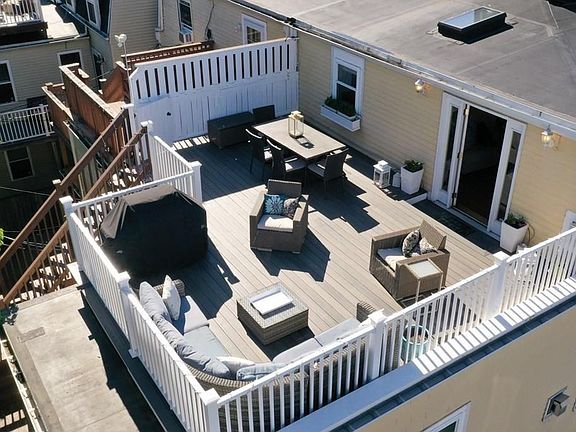 Beautiful and perfect, meticulously renovated and maintained home with one of the most amazing private decks in all of South Boston! Just two blocks from the beach, this top floor stunner is the ultimate city oasis. You really can have it all with this one...two equally sized bedrooms, stunning renovated bathroom, gas fireplace, open concept kitchen, PARKING and outdoor space right off your living room! And oh, what an outdoor space it is...The over sized 20 x 25 ft deck has been completely refurbished with composite decking and railings and provides a seamless extension of the living area (and roof rights should one wish to expand) for the ultimate place to relax and entertain. The whole home was curated with laser sharp attention to detail and beautifully appointed with designer finishes, fixtures and tile work. Worth mentioning again is the deeded parking spot directly accessed from back stairs off the deck. Other features include new HVAC system, Nest thermostats and extra storage.