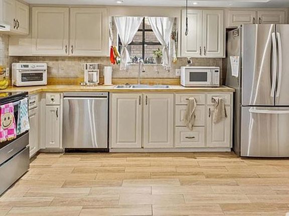 Spacious Kitchen Outfitted with stainless steel appliances, wood-look plank tile flooring, countertop space, ample cabinetry, kitchen-living room passthrough Window, and a dedicated pantry perfect for everyday cooking, weekend gatherings, or entertaining guests.