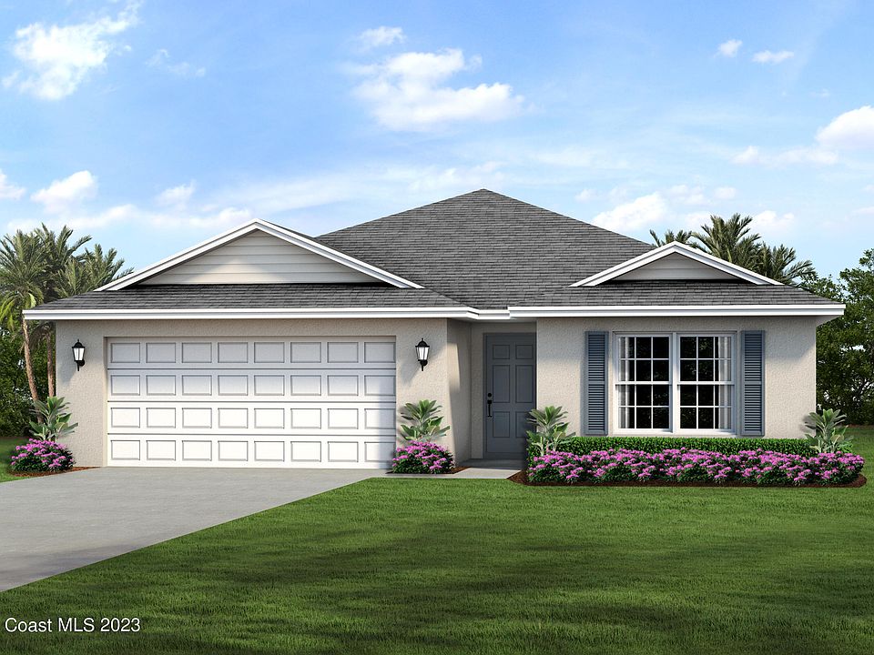 NEW CONSTRUCTION WITH WARRANTY! **MOVE-IN READY!!** The Palm delivers 1,550 sq ft of living space featuring a large Great Room under a vaulted ceiling and the private covered lanai just outside the sliding glass doors, perfect for indoor-outdoor entertaining. At the heart of this open floor plan, the kitchen boasts a freestanding island and walk-in pantry next to the dining room with a tray ceiling that's filled with natural light. The primary suite features a walk-in closet and bathroom with a dual-sink vanity, shower, and extra storage in the linen closet. This home boasts hurricane-impact windows and doors, designer cabinetry in the kitchen and bathrooms, a stainless steel range, microwave, and dishwasher, and an attached two-car garage. Pictures, renderings, & virtual tour are of similar home & are used for display purposes only. $10k FLEX CASH available for using preferred lender and title company.