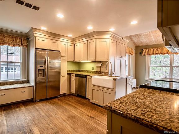 This 1830's Greek Revival exudes the quintessential charm of New England An amazingly maintained home with tasteful updates taking care to preserve the original period appeal. Large eat-in kitchen with loads of cabinet space, granite counter tops, porcelain farmhouse sink and stainless-steel appliances. There is a formal dining room with glass paneled doors, a den and a full bathroom with a large tiled shower stall. A pellet stove located in the living room is sure to ease the cost of heating during the cold winter months in CT. Moving onto the second floor you will find 4 bedrooms and a full bath. The master boasts a spacious walk-in closet with ample shelving. The roomy bathroom offers quaint shelving for extra storage and a bathtub with subway tile. Enjoy the sounds of the bubbling "English Neighborhood Brook" while you sit on the brick patio that stretches along the length of the house and there's just a short walk into the back yard to the custom built firepit, perfect for roasting marshmallows on a summer evening. The barn/garage offers a large bonus area (23'x17' with wide plank flooring and an additional room (13'x17' tons of possibilities here. Many Woodstock families have been raised and nurtured within this homes horsehair plastered walls. It is full of history and ready to help you write yours.