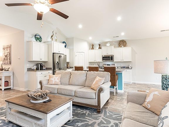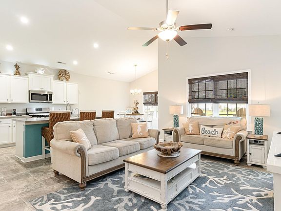 Stunning Home in Ocean Palms Community! Welcome to your dream home, featuring a picturesque pond view and just a golf cart ride away from beautiful Surfside Beach on the Atlantic Ocean. This home boasts an open Topsail floor plan with vaulted ceilings, creating a spacious and inviting atmosphere. Conveniently located, this home is near shopping, schools, restaurants, medical care and Surfside Beach is just across Hwy 17, only a short golf cart ride away. The kitchen comes fully equipped with stainless steel Frigidaire kitchen appliances and a reverse osmosis water filtration system. Enjoy the cost savings of living in a gas community. This home has a rare climate-controlled storage space within the two car garage, complete with an epoxy-finished floor.  The primary suite has plenty of space for a comfortable retreat and includes a large walk-in closet for ample storage while the primary bathroom features an oversized walk-in shower with seating. The extended concrete back patio is perfect for relaxing and enjoying the pond view and has a covered patio with a fan for warm days. And on those days, it's only a short walk to the community pool for a refreshing swim. The open floor plan is ideal for entertaining and daily living. Don't miss out on this incredible opportunity to live in the desirable Ocean Palms community. Experience the perfect blend of comfort, convenience, and coastal living.