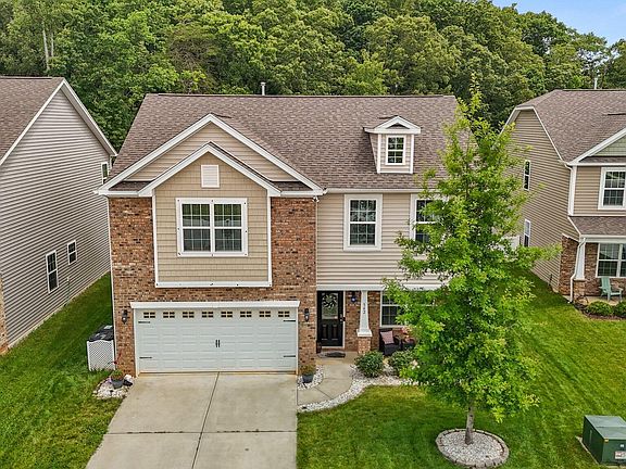 Spacious home on premiere lot with serene wooded views in the Alamance County section of the Cove at Mackintosh on the Lake. This home is full of thoughtful upgrades and extras. Enjoy outdoor living on the extended covered back patio with ceiling fans. The solid wood butcher block-topped island with a live edge adds warmth and character to the kitchen. Granite counters, tile backsplash, stainless appliances and pantry. Retreat to the vaulted primary suite featuring an electric fireplace and built in TV nook. Cozy up by the gas log fireplace in the living room, or step outside to huge covered patio overlooking the fenced backyard backing to trees, where a playset and storage shed offer added functionality. Additional highlights include a covered front porch, a two-car garage, 3 generously sized bedrooms plus a loft with closet, a formal dining room plus eat-in kitchen and much more. The community is known for its resort-style amenities, including a clubhouse, fitness center, junior Olympic pool, family fun pool with a 120-ft slide, tennis and basketball courts, sand volleyball, picnic areas, and playgrounds. Residents enjoy easy access to shopping, dining, and entertainment options at nearby Alamance Crossing and Greensboro.