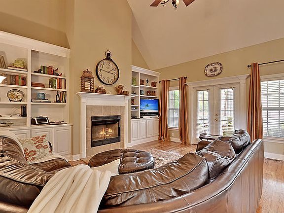 Beautiful and inviting 4 bedroom, 2.5 bath brick home with a welcoming front porch. Dramatic two-story foyer with a large decorative chandelier greets you as you enter with handsome hardwood floors throughout. The gorgeous formal dining room has a stunning arched entryway flanked by two columns, a trey ceiling, lovely chandelier, chair rail trim, two over-sized windows, and can easily handle your largest dinner party. Walk into the family room with its soaring two-story Cathedral ceiling, the large fireplace with built in media shelves/bookcases and the wall of windows, French door leading to the huge screen porch ideal for relaxing with a good book. The family room is open to the spacious eat-in kitchen with an expansive bar top and is perfect for entertaining with its mix of open floor-