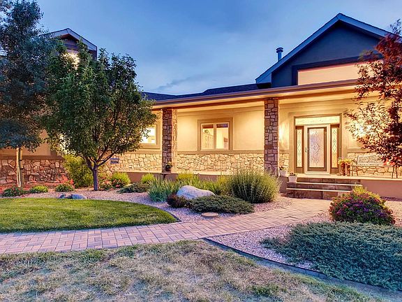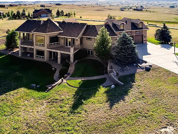 Gorgeous estate situated on over 5 acres with unobstructed 360 degree views including Pikes Peak & Longs Peak. Newly painted exterior & only the highest quality of custom finishes including Travertine tile throughout most of the main level. Beautifully designed open floor plan that features a two-story hexagonal great room w/ a beamed Pine ceiling, a gas fireplace and walls of windows that frame the Colorado skyline. The gourmet kitchen is a culinary dream featuring Cherry cabinets, slab granite counters, custom backsplash , center island w/ counter bar, veggie sink & pendant lights, high end appliances to include a Wolf gas top w/ a ss hood & a pot filler, Miele dbl wall oven w/ a warming drawer, steam oven, new microwave, a Sub-Zero fridge, buffet, a huge walk-in pantry & dining area that walks-out to the newly tiled deck. The office w/ French doors is off the great rm & could be a formal living room.