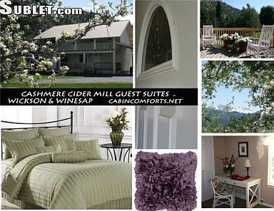 Sublet.com Listing ID 2552106- click here for more details and photos.Thank you for your interest in our Wickson Guest Suite; 1 bedroom, 1 bath for each suite, total 2 in home. Located 20 min (by car) from the famous Bavarian Leavenworth. Cashmere Location perfect between Wenatchee Valley, & Leavenworth in North Central Washington. Enjoy our next century of hospitality in completely refurbished 1910 farmhouse, short weekend getaway, wedding onsite, Fully furnished 1 bdrm 1 bath, self catering kitchen for vacation time or short term lease. Bath towels provided, hand towels and wash cloths, sheets, pillows, and washer and dryer. Includes wireless internet, trash, & water. Electric additional for longer lease. Furnished with cozy decor. *Points of Interest*Wenatchee Columbia River Recreation, Kayak, Canoe, Paddle board, beaches, boating Ohme Gardens Rocky Reach Hydroelectric Dam & MuseumCashmere Home of the world-famous Aplets and Cotlets Antique Malls Barns Etc Art Gallery & Tasting Room Cashmere Cider Mill Tasting Room & Guest Suites White water Wenatchee River raftingLeavenworth Wine Tasting Christmas Lighting & OktoberfestMileage Chart...From Cashmere Cider Mill Tasting Room & Guest Suites Seattle - 128 mi. Stevens Pass - 42 mi. Spokane - 182 mi. Tacoma - 139 mi. Lake Chelan - 34 mi. Leavenworth - 12 mi. Tri-Cities - 120 mi. Portland - 285 mi. Sandpoint, ID - 249 mi. Coeur dAlene, ID - 214 mi. Yakima - 88 mi. Vancouver, B.C. - 234 mi. Wenatchee - 6 mi.*Local Needs*Grocery Store- - 5 min. Casa Grande Very Good Restaurant - 5 min.Blue Flame; Brians Pizza; Country Boys BBQMake yourself at home and enjoy your creekside vacation.The rural neighborhood is very quiet. Little to no traffic, close to Leavenworth Washington white water rafting, mountain snowboard/ski @ Mission Ridge & Stevens Pass; Lake Chelan. Within 20 minutes away from Columbia River to soak up soothing 300 days of Was A portion of listings appearing on RentNice.com are provided by a partnership with Sublet.com, a division of Spyder Web Enterprises.
