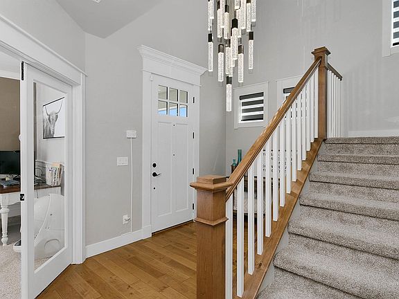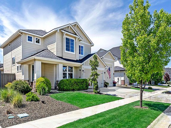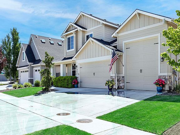 Welcome to one of the most sought after neighborhoods in Meridian! Century Farm boasts quick access to the new South Meridian YMCA, Hillsdale elementary, community pools & multiple parks. This Todd Campbell custom home will exceed your expectations w/ inviting atmosphere, stunning grand chandelier, & open layout. Chef's kitchen w/ oversized island/ breakfast bar, double oven, built-in gas range, spacious pantry, & more! Kitchen opens to eating area/great room w/ gas fireplace, large windows, & door to covered patio. Home has 4 bedrooms plus office and bonus room, which could be used as 5th bedroom. Main level suite with ceiling coffers & feature wall. Bathroom with dual vanities, walk-in tile shower, soaker tub, tile flooring, & large walk-in closet. This home has one of only five RV garages (with 12' door) in the neighborhood. Also equipped with car lift, epoxy floors, & some shelving. Beautiful grounds w/ garden boxes, matching storage shed, & plenty of extra space for toys + solar panels paid in full!