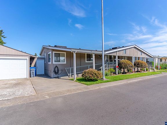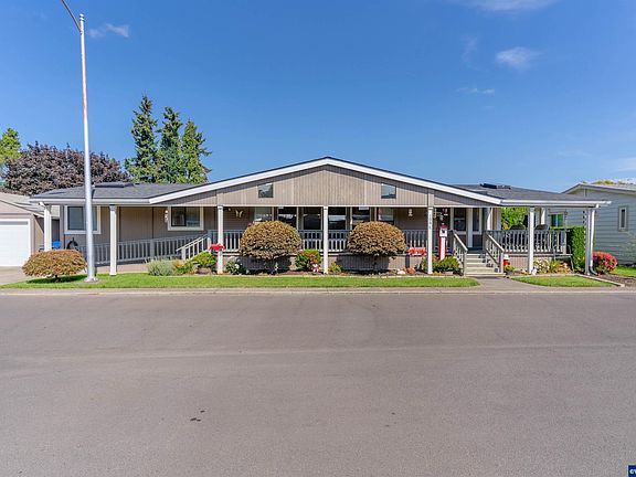 Incredible deal on a beautiful manufactured home. Stunning wall of windows in front room. Huge covered front porch and covered back deck. ADA accessible. New flooring throughout (Pergo TrafficMaster). New interior paint, dishwasher, water heater, back steps and deck, garage door and opener, 2 man-doors at garage. Garage roof cleaned and repaired. Back storage/office room redone. HVAC regularly, recently serviced. 55+ Park. Park Rent $955 (includes water) + $65 sewer, trash, storm water.