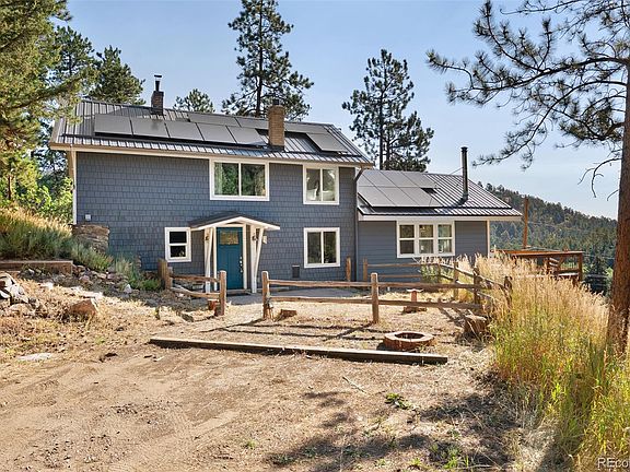 Perched in the serene mountain community of Indian Hills, this thoughtfully remodeled residence blends modern comfort with rustic charm. Set on a spacious 27,000-square-foot lot, this home welcomes with a new living room addition featuring floor-to-ceiling windows framing breathtaking southern exposure and sweeping mountain vistas. A chef’s kitchen boasts stainless steel appliances, Silestone countertops and a gas range, while two cozy wood stoves add warmth throughout. Soak in stunning views from the luminous primary suite. Entertain on the expansive Trex deck, enjoy fenced garden areas with a dog run or envision possibilities on the ready slab with its own septic — perfect for an RV, ADU or tiny home. Recent upgrades include new solar panels, a tankless water heater, new roof, electrical, paint and windows, ensuring ease of living. Just 25 minutes from downtown Denver and moments from world-class trails, this mountain retreat offers both modern efficiency and urban accessibility.