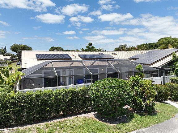 Welcome to 5424 Eagle Lake Drive, a beautifully updated 3 bedroom, 2 bathroom villa in the highly sought after Westwood Gardens community of Palm Beach Gardens. This hidden gem offers a private, newly resurfaced screened-in pool set within a spacious courtyard and a cabana bathroom for convenient indoor-outdoor living. Step inside to discover a modern, one year old custom kitchen featuring shaker white cabinetry, striking black quartz countertops, a stylish backsplash, pantry, new appliances, pendant and recessed lighting, and crown molding throughout. This home boasts ceramic plank tile and wood flooring, vaulted ceilings with skylights, high windows for abundant natural light, plantation shutters, and zebra shades on the sliders. Enjoy peace of mind with hurricane impact windows and doors, plus a newer metal roof (2017), installed by the association, and energy-efficient solar panels that help lower your electric bills. The master suite boasts California Closets. Additional upgrades include a one-year-old AC unit, full-size stackable washer and dryer, and generous storage space with ample closets.