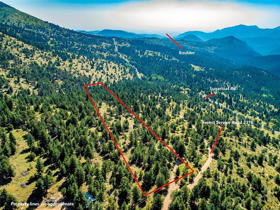 Building Lot. 18 min from Boulder on paved Sugarloaf Rd and 0.2 miles up the two-wheel-drive Forest Service Road 237E. Borders US Forest Service land. Views, a healthy tress, gently sloping terrain, 5.38 acre. Boulder SPR approval for up to a 5,400 sf residence and an 816 sf out building already secured. Electricity is to the property, well and septic permit in place. Site specific Design Development level plans are included for both a 4 bedroom and a 3 bedroom mountain contemporary home.