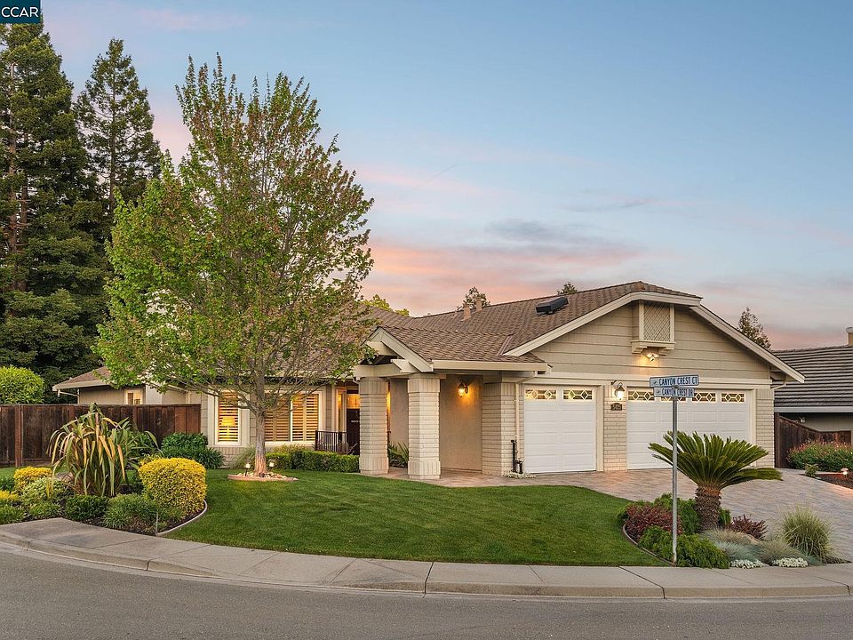 Welcome to this beautiful single-story home positioned on a sprawling corner lot within the coveted Canyon Crest neighborhood. Step inside to notice vaulted ceilings, hardwood floors & an abundance of natural light cascading through plantation shutters. The front-facing living room beckons w/a cozy gas fireplace & flows into the formal dining area. The well-appointed kitchen boasts stainless steel appliances, granite counters, recessed lights, travertine floors, breakfast bar, custom cabinetry & breakfast nook. Adjacent to the kitchen, the spacious family room invites relaxation w/built-in storage, a gas fireplace & a sliding glass door leading to the expansive backyard. The luxurious primary bedroom retreat showcases dual closets outfitted w/Elfa organizers, a sliding glass door for direct backyard access & an ensuite bath complete w/dual sinks, stall shower & soaking tub. 3 secondary bedrooms, a shared hall bathroom, laundry room & access to the 3-car garage are down the hall. The fully fenced backyard offers an oversized patio, putting green & ample space on the side yard for potential dreams. Conveniently located near Bishop Ranch, FWY access, & top-rated schools this exceptional home offers both luxury & convenience.
