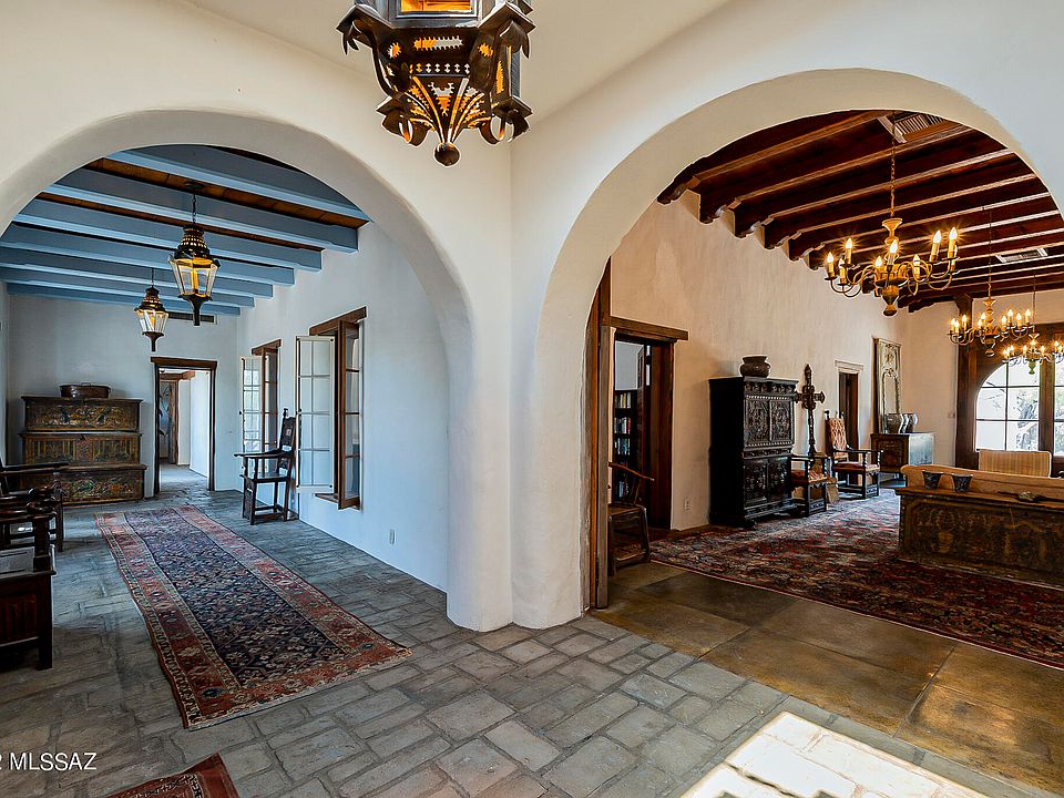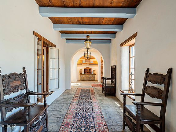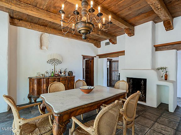 One of Tucson's most significant and historic properties is now on the market. This amazing Adobe Hacienda style home, built as the US Calvary's trading post in 1873, has had only 3 previous owners. Enter through the hand carved wooden arched entryway to the zaguan or grand living room. Four generous bedrooms (2 w/sleeping lofts) flow seamlessly from the living room. The master bedroom has THE most breathtaking view of the 60 ft long, stone edged pool! At the end of the pool the unobstructed view continues to the majestic Catalina mountains. The master bedroom's ensuite bathroom features hand glazed tiled double sink vanity, double WC, walk in shower, tiled tub w/vintage, carved Jaguar head waterfall spout, and a spacious walk in closet. Traditional double windowed 9 ft x 54 ft gallery leads to the massive wood beam ceilinged formal dining room with a wood burning fireplace & sliding doors to a stone lined courtyard, perfect for alfresco dining. The spacious, tiled countertop kitchen features a working, vintage Wolf stove w/extra griddle space. A mature, thriving Mesquite tree is growing right in the middle of the great "pantry" which also has a chilly 4 ft x 8 ft walk-in refrigerator with plentiful wine storage. The extensive fifth bedroom is just through a carved wooden door, off of the breakfast nook in the kitchen. This individual area has it's own entry from the outside & features a bedroom, complete with fireplace, 2 closets in the bathroom, and 2 living areas, both with fireplaces. This suite has wonderful views of the rear of the property and the sparkling water feature/pond. A free standing guesthouse, with private entrance to the outside features one bedroom, complete kitchen & bath & living room w/fireplace. There's a private, walled courtyard off the living room. This charming, adobe bungalow casita would be ideal for in-laws, friends, or, possible, rental income. Property has an enclose 2 car garage, 3 car carport, a 2 room pool house for ample storage, a separate pump room for pool equipment, and another outbuilding for whatever you require. There are too many unique elements of this property to list! Step back in time with this fascinating property's 149 year history, while enjoying the comforts of today. Recent updates include new A/C units,