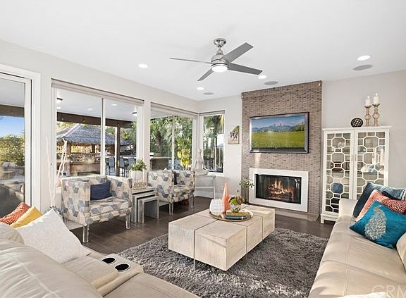 Simply stunning! Nearly every surface has been improved upon in this amazing home boasting a sleek contemporary vibe. Unique designer-select lighting, handsome hardwood flooring, custom wall and window treatments, and an incredible gourmet kitchen outfitted for the hidden chef in all of us. Sleek quartz countertops, huge center island, six-burner built-in range, stainless appliances and custom cabinetry including wine storage and dry bar. Two fireplaces in the home are finished with glass tile or stone accents. Family room offers a wall of windows that bring the incredible backyard amenities into view. Downstairs en-suite bedroom plus Powder Room and Laundry complete the lower level. Ascending the graceful staircase, enter the sumptuous primary suite with remarkable city lights views, especially enjoyed as you step out onto your private balcony. Bathroom transcends a spa-like feel with glass-topped dual vanities, and an oversized walk-in shower. Three additional bedrooms (one bonus-room sized) are finished with mirrored wardrobe doors, engineered hardwood flooring, and a dual vanity updated bath that completes this level. Outdoors is where you will want to be .. splash away in the pebble-finished sparkling pool and spa, gather 'round the built-in BBQ center for a tasty outdoor meal, or cozy up to the fire pit for those chilly evening get-togethers. Fabulous floor plan, upgrades and location! Attends Yorba Linda High School and a short stroll to Bryant Ranch School.
