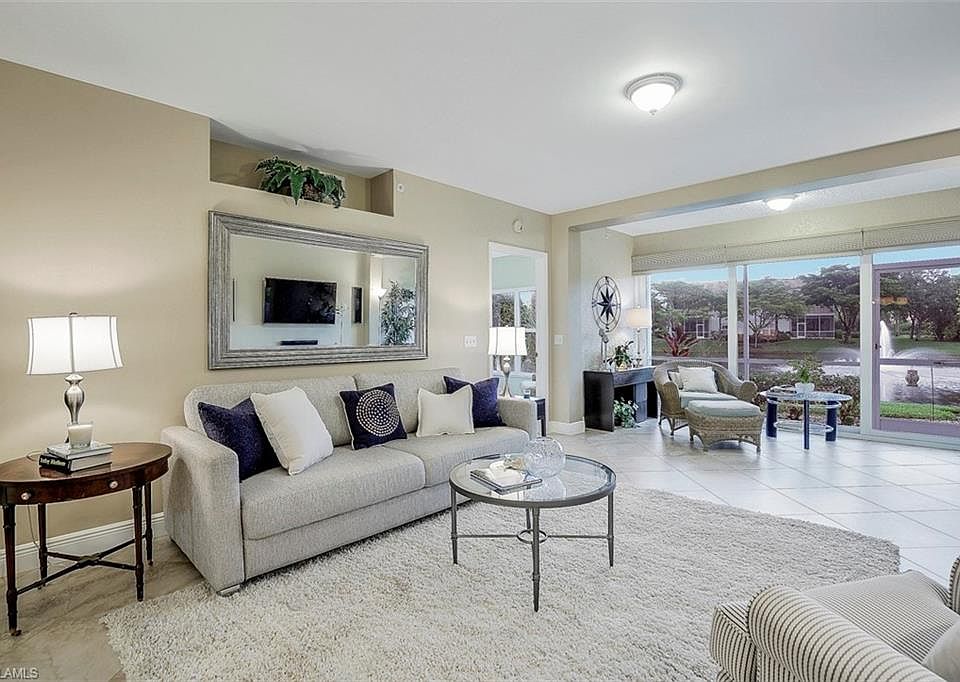 C.15142 - Beautifully updated 1st floor unit w/private lake,fountain & preserve views. Enjoy an updated kitchen w/newer stainless steel appliances, updated cabinetry, tiled back splash & granite counter tops. Spend time with family & friends in this spacious living room w/24" tile flooring laid on the diagonal that extends to the recently enclosed lanai with floor elevated to living room level and tiled to create an expansive living area/sun room that has Impact Resistant sliders rated to 200 mph & Hunter Douglas motorized shades. Other notable items include in unit laundry, eat in kitchen nook,covered parking space & 2nd bedroom equipped w/Murphy bed system & mounted TV that will convey w/unit. This location is steps to the local resident pool & master club house. Located at the corner of Immokalee & Livingston Rd., Carlton Lakes is less than 15 minutes to beaches,restaurants and shops. This is an amenity rich community featuring a master club house,fitness room, community room,60' lap pool, hot tub & library. Enjoy the use of its tennis & bocce courts, walking & biking trails. This unit is also being sold with a 1 year home warranty that will convey to the new buyer at closing.
