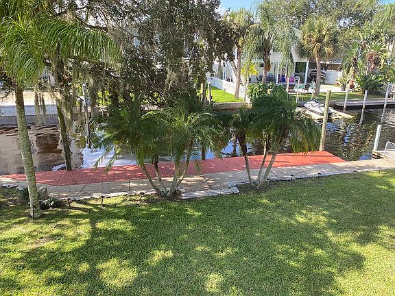 WATERFRONT with direct access to the Gulf of Mexico. No bridges to open gulf! Over 100 feet of concrete seawall and docks. 3 bedrooms with bonus room/office, and 4 bathrooms. Spacious master bedroom with en suite, walk in closet, and private screened porch. Additional bedrooms also have en suite bathrooms and walk in closets. Kitchen features eat in area with built in table and hickory cabinets. Large living room with views of the water, formal family room boasts wood burning fireplace, skylights, bar area, and full bathroom. A few updates can make this property your dream home on the water! Backyard is spacious and features mature landscaping with plenty of shade from oak trees, expansive sea wall and dock, heavy duty davits to lift boat, vinyl fencing AND outbuilding featuring a built-in bar, half bathroom, and storage area. Located on a Cul-de-sac, this home is nestled on 0.32 acres of land. Over sized garage with hidden safe room. Plenty of parking in yard for boat trailer, RV, etc. Quiet upscale waterfront neighborhood. Miller's Bayou is a perfect location: walk to waterfront parks, restaurants, marina, fishing charters, casino boat, and boat rentals. The City of Port Richey is golf cart friendly. Repaired settlement.