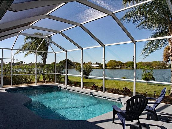 If you are looking for an updated, move-in ready pool home with a fantastic view of the lake, enjoy watching birds and aquatic wildlife from your backyard in a location that is convenient for commuters, this is the home for you! Start the day sipping coffee from your screen lanai while watching nature or your favorite morning show. Enjoy a dip in the heated pool and end your day watching the amazing sunset. Many improvements have been made to the home since 2016 and include renovated and upgraded kitchen and baths, including cabinets, counters, lighting and fixtures, with new ceramic plank flooring in baths. All bedrooms updated with new paint, vinyl plank flooring in master and third bedroom, (carpet in bedroom two), lighting and ceiling fans, new hardware and hinges throughout. Stainless steel appliances in kitchen, washer/dryer, 3-wall mounted cable ready TVs and pool furniture (except blue chairs) stay with buyer. Additional improvements include vinyl windows in covered screen lanai, new pool heater in 2016, new HVAC in 2018, exterior and pool deck painted in 2019. Publix and Moccasin Wallow Golf Course are less than 1.5 miles away. Nothing to do but move in and enjoy! Great property for investors too!