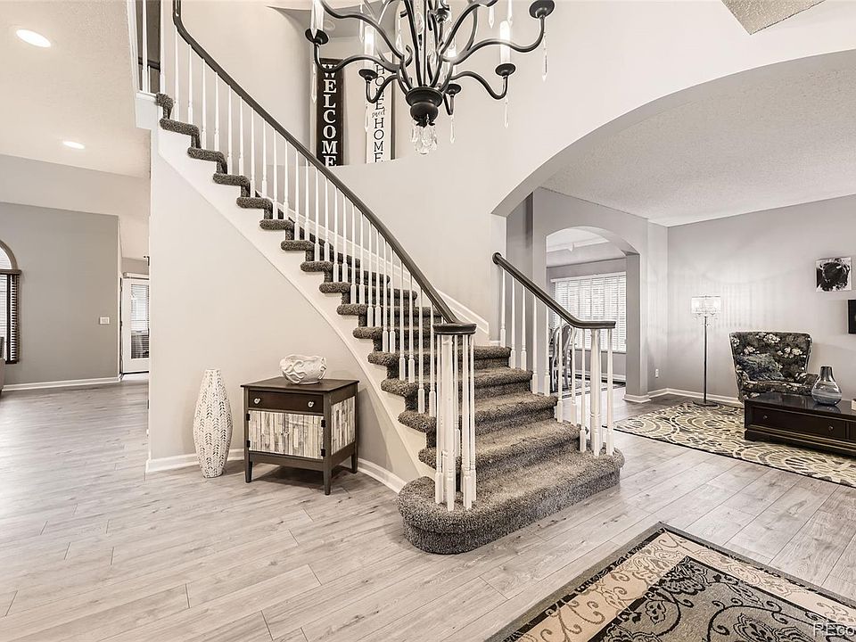Welcome to this meticulously maintained & elegantly updated 5bd/5bth home in the prestigious Piney Creek community. Nestled w/in the highly sought after & award-winning Cherry Creek ISD, this spacious executive residence offers a perfect blend of luxury, comfort, and modern upgrades. Recent enhancements include interior & exterior paint, Class 4 impact-resistant roof, insulated garage doors, new flooring, high-efficiency HVAC, premium Halo whole-house water purification system. Outdoor living is just as impressive, featuring a new concrete patio, walkway, pergola, a covered porch w/ lighted ceiling fans, ideal for year-round enjoyment. As you step inside you notice the breathtaking 2-story entryway, illuminated by a dramatic chandelier and a grand circular staircase. Designed for both entertaining and everyday living, the bright & airy formal living room flows seamlessly into a spacious dining room. The impressive chef’s kitchen boasts abundant cabinetry, ample counter space, large walk-in pantry, an inviting eat-in area overlooking the backyard. The cozy family room features skylights that bathe the space in natural light, brick fireplace, built-in bookcases. The main level includes a sun-filled office w/ French doors & built-in bookcases, laundry room, a ¾ bath. Upstairs, 4 well-appointed bdrms provide comfort and privacy. The expansive primary suite is a retreat of its own, w/ vaulted ceilings and a luxurious en-suite 5-piece bthrm featuring dual vanities, walk-in shower, whirlpool tub, oversized walk-in closet. The secondary wing hosts 3 spacious bdrms, a full bath, while the third enjoys a private en-suite. The finished basement offers versatility, including a 2nd primary suite w/ a massive walk-in closet & en-suite bath. A large flex space w/ a wet bar can be a gym, game room, in-law suite. HOA amenities, includes parks, playgrounds, pool, tennis, basketball & pickleball courts, clubhouse. Located in Greater Denver’s most desirable areas!