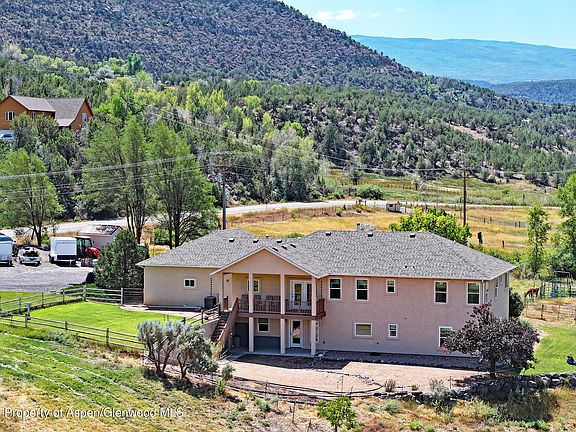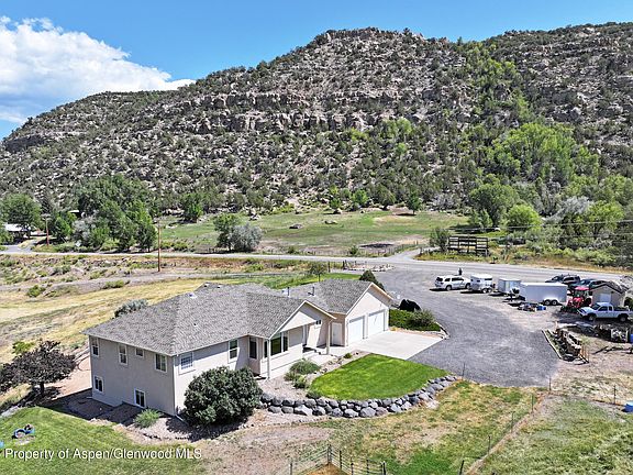 Colorado mountain valley custom-designed home with acreage, surrounded by stunning views. Enjoy a peaceful country lifestyle near the historic towns of Collbran and Mesa, just a short drive from the I-70 corridor. This meticulously maintained 10.5-acre property features partially fenced pasture and corrals, with the mountain waters of Plateau Creek rushing along the lower property line. The beautiful 3-bedroom, 3½-bath home includes a full unfinished walkout basement, ready for your personal décor and finishing touches. A gravel driveway leads to ample parking, concrete parking pad, an attached 3-car garage, and walkways to the covered entryway, with mature trees and shrubs adding to the property's curb appeal.
