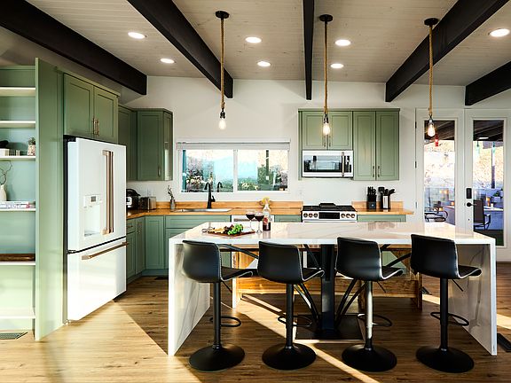 The kitchen at Sunset Point is a chef's dream come true. Fully equipped with high-end Cafe appliances, it features a large island with ample counter space and bar seating. Whether you're preparing a gourmet meal or hosting a casual brunch, this kitchen provides everything you need to create memorable culinary experiences.