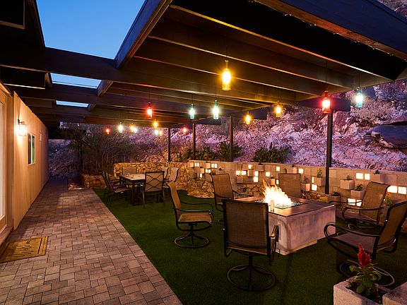 Nestled at the peak of a mountain, Sunset Point offers panoramic views that are nothing short of spectacular. The front patio is furnished for both lounging and dining, complete with a cozy firepit for those chilly desert nights. Unique bottle lights illuminate the space, creating a warm and inviting atmosphere. The lower level patio provides direct access to the heated infinity pool, where you can enjoy a refreshing swim year-round while soaking in the stunning scenery.