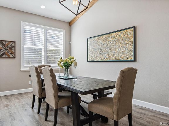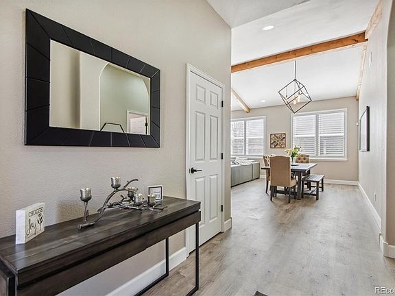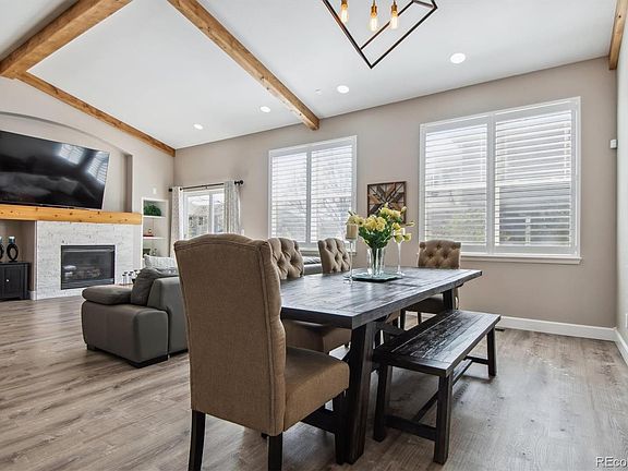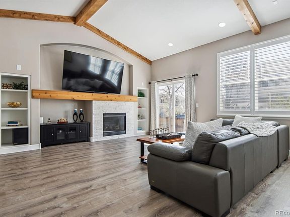 Welcome to this stunning ranch-style home. This spacious home offers a contemporary and open floor plan with exquisite design details throughout. Cathedral Ceilings and Handmade Wood Beams in great room and dining room enhance the feeling of openness and airiness in the living spaces. The interior of the home showcases vinyl plank flooring throughout that ensures durability and easy maintenance. The open kitchen is a true focal point of the home, featuring updated granite countertops, custom wood cabinets, and newer appliances that are as functional as they are stylish. The primary bathroom has been tastefully remodeled to create a spa-like retreat within the home. You'll find a stunning walk-in shower, modern fixtures, and sleek finishes that exude luxury and sophistication. The large walk-in closet with well-planned custom built-ins and custom barn door adds a contemporary flair. In addition to the impressive main level, this home also boasts a large unfinished basement providing you with endless possibilities to customize and expand the living space to suit your needs. The inclusion of a radon mitigation system underscores the attention to detail and commitment to safety in the home. Outside, the property is equipped with a sprinkler system in both the front and back yards, providing ease of maintenance. With easy access to local amenities, shopping, dining, DIA and major transportation routes, you'll have everything you need right at your fingertips.
