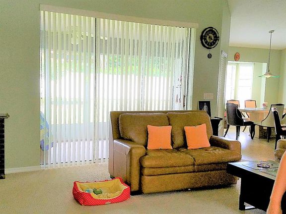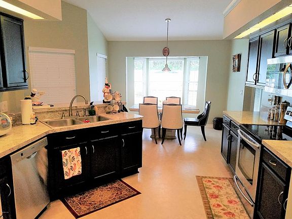 SW Ocala, Majestic Oaks in the heart of everything. Near I 75, this well loved home offers space and convenience. 2 bedrooms, 2 baths, volume ceilings, split bedroom plan. Eat in kitchen with updated Stainless appliances, kitchen also has breakfast bar. Master with large walk in closet. Master bath features dual vanities, garden tub and separate shower. Living room and dining room. Triple sliders lead to screen enclosed lanai and privacy fenced yard. Indoor laundry. Updated AC.