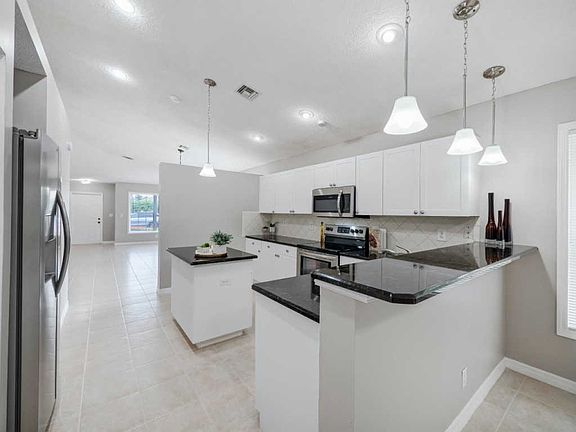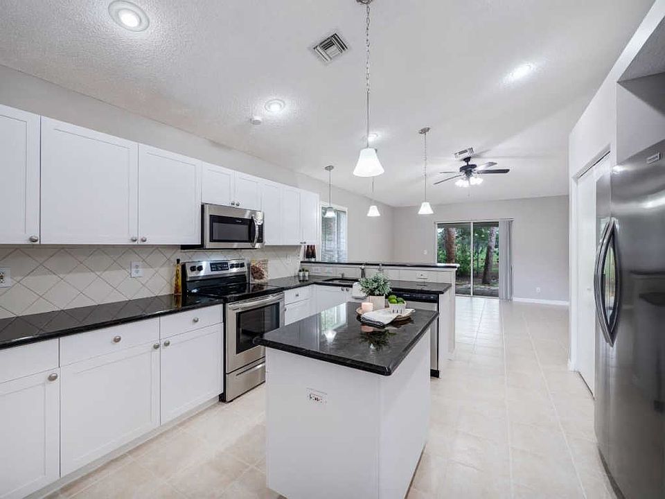 MOVE-IN READY! This 3 bedroom, 2 bath home has been FRESHLY RENOVATED! Outside, you will notice nice curb appeal, freshly painted front door + new hardware. Inside, the walls and ceilings have all been painted, new blinds were installed throughout. In the kitchen you will find several upgrades, including new white cabinets, brand new stainless steel appliances, granite countertops and an island. New lighting has been installed as well. A new sliding glass door has been installed that leads to the backyard where you'll find a covered patio with a built-in grill that overlooks a beautiful park. In addition, the hall bath has been renovated and the garage has been freshly painted, including the ceiling and floor. It also has a a new garage door opener and brand new AC. The interior laundry...