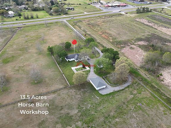 This home sits on 13 beautiful acres and features a separate workshop, a large concrete horse stable barn, and an attached double-car garage with a washer and dryer. Inside the house, there is wood-looking flooring throughout, a living room with built-in shelving and fireplace, a kitchen with a gas stove and stainless steel appliances, a breakfast nook, a dining room, a den area, three bedrooms, two full bathrooms, and a sunroom covered in natural light.