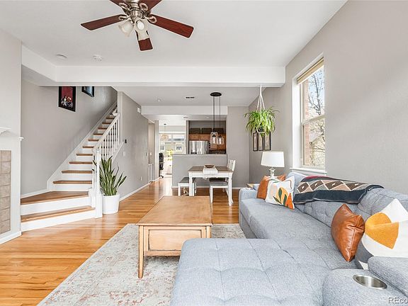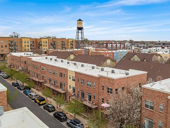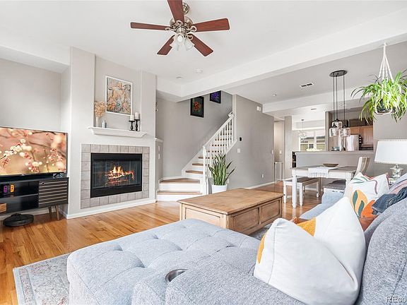 Welcome Home! This corner unit, 2 bed (+ flex office space), 3 bath turnkey home boasts a host of impressive features and is perfectly situated just ONE block from the iconic Arvada Water Tower! Enter through the heated foyer with direct access to the spacious 2-car tandem garage with ample storage, 220V EV charger, as well as an attached water hose perfect for washing your car (HOA pays for your water too!) Second level boasts pristine hardwood floors, cozy gas fireplace, and luxurious tall ceilings. Kitchen is complete with stainless steel appliances, including a double oven and a french door fridge with a double freezer. Just off the kitchen you'll find a versatile flex room, ideal for an office, bar area, or additional living space to suit your needs. Enjoy your west-facing balcony, perfect for relaxing and enjoying the view of lush blossoming trees in the community’s beautifully landscaped outdoor spaces. This is one of FEW units in the community that is private, and detached balcony from the neighboring townhomes. Upstairs, you'll find two generously sized bedrooms, both located on the same level as the convenient washer and dryer closet. These rooms beam with natural light, have ample closet space, and each are positioned near their own