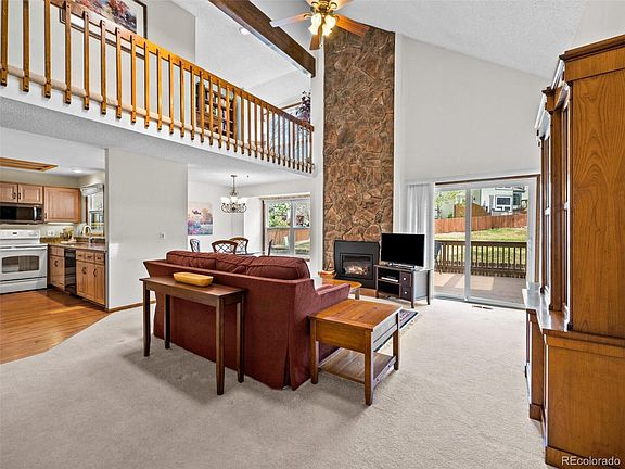 - Description: Vaulted 2 Story Ceiling, Floor To Ceiling Stone Hearth Gas Fireplace, Carpet, Skylight, Lighted Ceiling Fan, Slider To 15 X 12 Trex Style Deck In Fenced Yard With Brick Patio Overlooking Neighborhood Park Like Setting Of Open Space