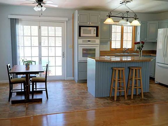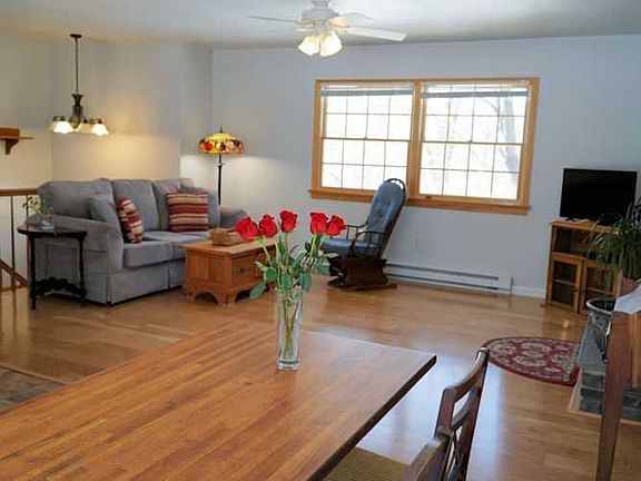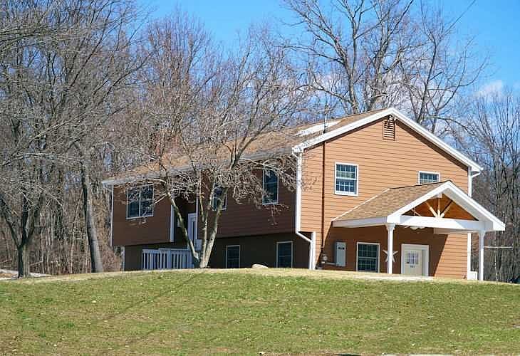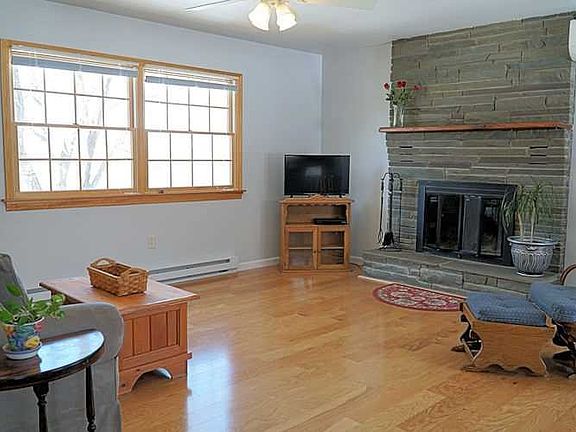 Renovated, attractive 2 story home offering privacy on 3 acres with spring fed pond, private road access and land surrounded by farms. A quiet and relaxing setting for this light filled bi-level. The first floor offers an open floor plan allowing for views of the grounds and pond. Enjoy large common rooms with fireplace or pellet stove.This attractive 3 bedroom/2 bath house features a kitchen with island and dining area, large family room with alcove great for play/game area and a private home office. Relax on covered deck accessed from the French door off kitchen. Paddle boat on the spring fed pond or take a walk in the woods.Barn/garage with workshop and 2 car parking. An idyllic setting.