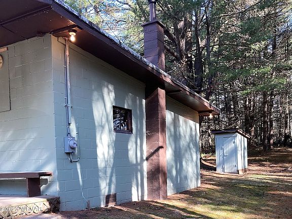 This a a very well built Concrete block constructed cabin in the woods. Aluminum roof. Storage shed is 13 x 10 with electric. There is a bath on the path (privy) with electric there too.