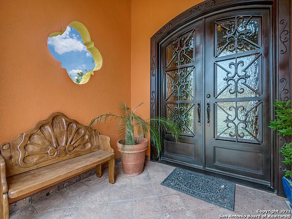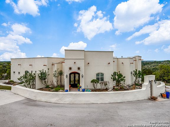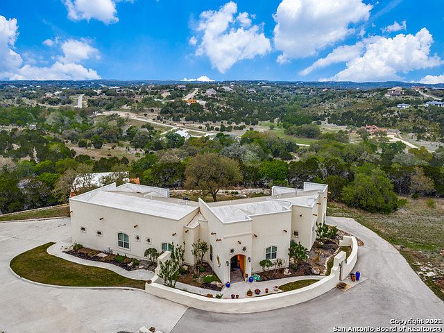 Come home to this magnificent, one of kind Spanish Style Hacienda in the Hill Country of Texas. Located in the highly desired neighborhood of Mystic Shores, this gorgeous home has unique features. This well-crafted masterpiece exudes style and elegance with high ceilings, open floor plan, custom hand carved pergola style bar, beautiful colors, Mexican hand painted tile, 8 ft solid alder custom wood doors, plantation shutters throughout, and RO systems in both kitchens. All back doors open to the expansive patio and outdoor retreat perfect for entertaining. This hill top 2960 sf, 4 bedroom, 3.5 bath home has breathtaking views, patio area for barbecuing and secluded hot tub for relaxing. Don't forget the additional 700 sf guest Casita with bedroom, bath, living room, kitchen and laundry with handicap accessibility. Double metal doors from the driveway lead to a large workshop/storage room not to mention the oversized 3 car garage. Located in the heart of the hill country between Austin and San Antonio with amenities including two community pools, lakeside park, sports courts, community boat ramp, community boat & RV parking, and beautiful nature preserve. This Hill Country retreat is a must see.
