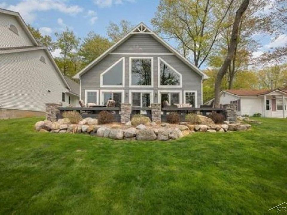 This Houghton Lake waterfront retreat is a stunning four-bedroom, three-bath home offering over 3,000 square feet of living space. It's the special details that make this home complete: two-story great room with a wall of windows, with gorgeous lake views; a lake stone fireplace preserved from the original 1935 home, now is gas burning; luxury vinyl flooring throughout; travertine in the bathrooms with custom vanities and granite countertops; stone backsplash; and tongue- groove pine ceilings. Offering loads of space and storage, the bonus room and main floor den includes a murphy bed increasing the potential bedroom count to six. Spend your evenings watching spectacular sunsets on the composite deck or relaxing by the fire pit on the sandy beach. Vinyl dock with sitting area and fishing boat lift. Plus, a 50x24 garage is included for all of your toys. These are only a few of the special features of this home. Call today for your private tour of this one-of-a-kind retreat!