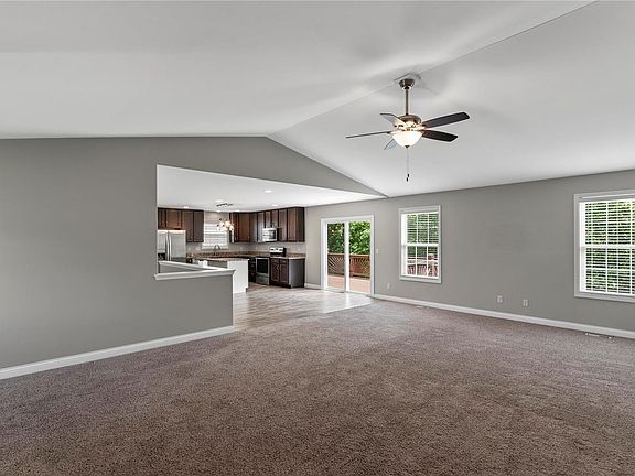 WELCOME HOME to this beautiful 3BR, 2BTH 1670 SF ranch in the desirable Newport Meadows  subdivision! Nestled on a premium lot backing to trees this home has welcoming curb appeal featuring a vinyl front w/brick accents, lush landscaping & 2 car garage. The MOVE-IN-READY interior offers an open floor plan w/a spacious great rm w/tall, vaulted ceilings. You'll LOVE the kitchen w/custom 42" cabinetry, center island w/bkft bar, granite countertops, SS appliances (all included), pantry, & bkft rm w/slider to the deck