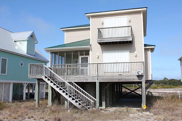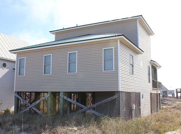 Super nice 3 bedroom/3 bath third tier beach home located in Fort Morgan. It comes with 9 ft. ceiling on both levels, 19 ft. ceiling over dining area, walk-in closets, storm shutters, both screened and open decks, double lavatories in master bath, crown molding, cultured marble tub/showers, and great gulf views and access. Seller is a licensed real estate broker in the state of Alabama.