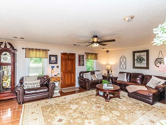Wonderful country home on 2.5 acres! Space and beauty abound in this home inside and out! Upgraded kitchen and HUGE pantry and laundry rooms. Enjoy two primary bedrooms. Floors are hardwood, tile, and new plush carpet. There is a cozy sunroom off the kitchen and a large dining room. Stone fireplace in living room has ventless gas logs. Downstairs primary bath has a large shower and oversized dressing room. New Champion windows. Outdoor deck with metal roof gazebo. Fenced yard and creek below!