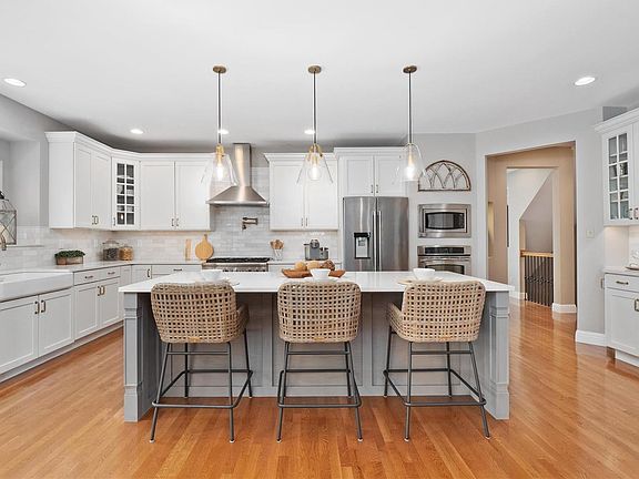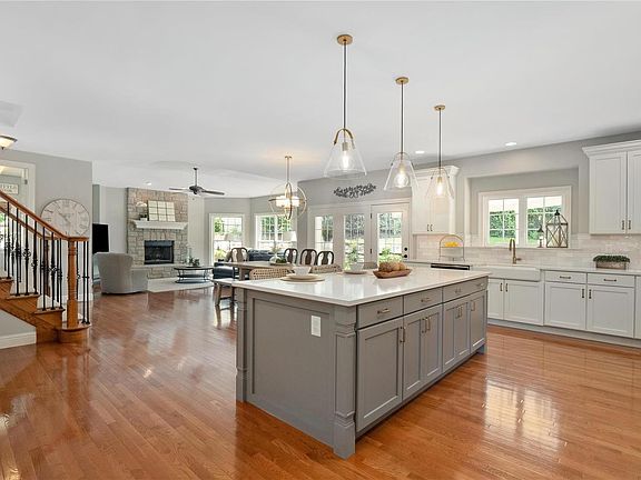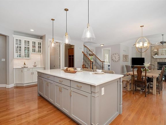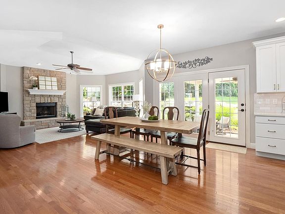 This spacious custom home offers more than 5100 sq ft of gorgeous living space! Entry foyer is flanked by the dining room and office, and offers a connection to the main floor primary suite. Luxe primary bath features walk-in shower, soaking tub, dual vanities and designer closet. Soaring great room with gas fireplace provides a beautiful view of the pool. Updated and upgraded kitchen features 42" white cabinets, large center island, quartz countertops, tile backsplash, Thermador gas stove, pot filler, walk-in pantry and cubby nook. Vaulted hearth room is highlighted by a stone fireplace and offers access to the rear staircase, main floor laundry and outdoor living space. Covered patio leads to the stunning in-ground saltwater pool, surrounded by beautifully landscaped grounds backing to a wooded view-such a peaceful retreat. 2nd floor offers high ceilings, 3 additional bedrooms-all en-suite, and an enormous loft/playroom. Lower level offers egress window and rough-in for full bath.
