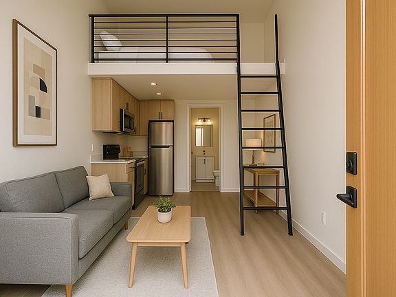 Brand-new loft-style residences that pair minimalist design with everyday convenience. A crisp white-stucco facade, oversized black-framed windows, and warm wood entry doors set a modern tone before you step into a sun-soaked living area crowned by double-height ceilings. The main floor features an efficient kitchen with full-height cabinetry, refrigerator, an in-unit washer/dryer, and a sleek full bath, while a spiral staircase leads to a generous loftideal for a bedroom or studiooverlooking the space below. Pristine, stylish, and move-in ready, these boutique homes offer an inviting retreat just moments from local cafes, transit, and neighborhood amenities.