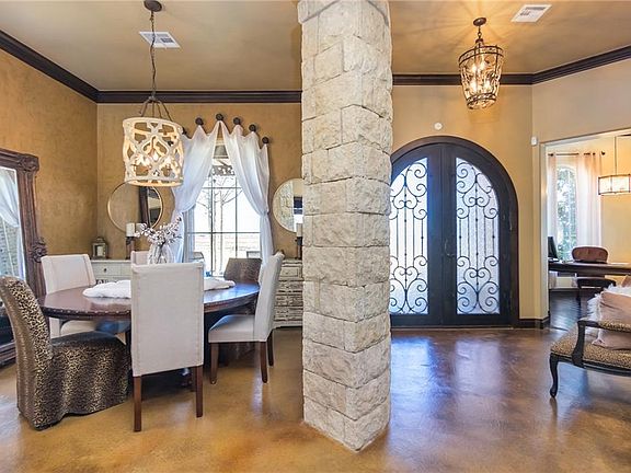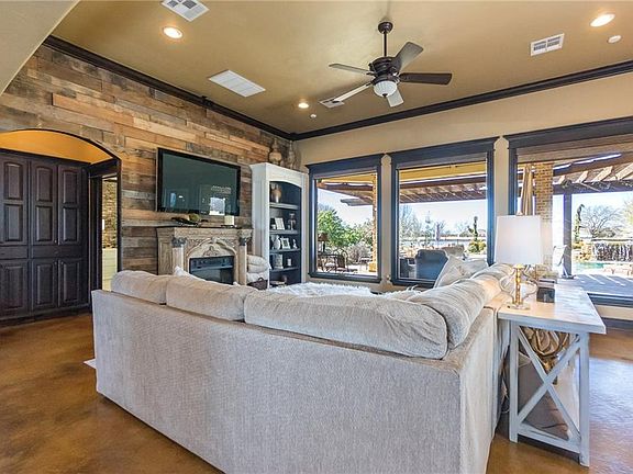 Quietly tucked away behind privacy gates this exquisite home awaits. From the pergola front porch to the beach entry, resort-style pool/spa and views of the lake, this home reflects a lifestyle. A fresh mixture of design and décor give this home a timeless look. Accent 'wall of woods' in the living room, stunning panoramic views of patio, pool and lake make this a favorite spot. Conversation bar connects living room and kitchen. Arched prep island has cooktop, there's a barista bar and hammered copper sink, cozy breakfast nook. The Master retreat has French doors to patio/spa. Luxurious bathroom has chin-deep jetted tub, dual head shower, closet with 3rd row rack. Secondary bedrooms have Jack & Jill bath. Laundry room has ample storage, soaker sink. There is a home office, pool table-sized game room plus media room. The large patio is ideal for entertaining, relaxing or collecting your thoughts at the end of the day with stunning views of the pool and lake year around. Storm shelter.