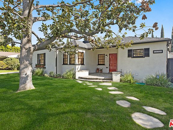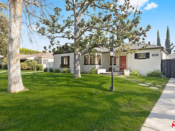 Charming, light and bright Valley Village Traditional home on beautiful tree-lined street with wonderful character and flow. Living room with fireplace and crown moldings leads to step-down family room with great volume - tall vaulted and beamed ceilings. French doors open to huge private yard. Large detached two car garage. Hardwood flooring and tile throughout. Gorgeous master has oversized walk-in closet, built-in vanity and private bath. Close to metro and places of worship. Photos are virtually staged.
