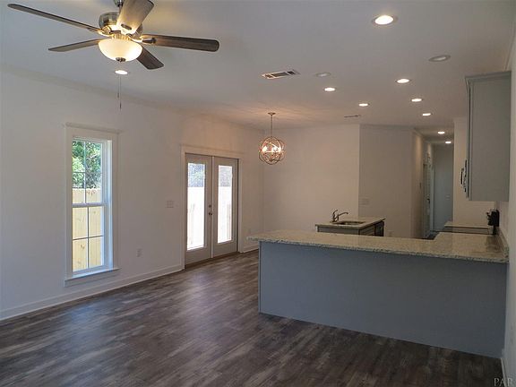 Be prepared to be amazed as you walk through this lovely foyer with 9 foot ceilings with crown molding and beautiful luxury vinyl plank flooring in all living areas. This home is nicely appointed and will surprise you with the amount of storage space found on this CAPE floor plan just rolled out by Perdido Construction. The living space is all very open with lots of windows for natural lighting. You will love the beautiful kitchen with custom wood cabinets and choice of door styles and colors as well as your selection of granite. The kitchen comes well equipped with GRANITE, stainless steel appliances, breakfast bar, recessed lighting, window over the kitchen sink and the LARGE WALK IN PANTRY. The open dining /living room have plenty of windows, crown molding, ceiling fan and french door to your spacious COVERED BACK PORCH for your complete outdoor enjoyment. The master suite will amaze you as you walk through the barn door into alcove area (privacy)you will find a storage closet to the right and spacious master bedroom with 4 windows, ceiling fan, crown molding and carpeted floors. You will love the master bathroom with its generous amount of space with double vanities with granite, LVP flooring, tub/shower, linen closet and EXTRA LARGE WALK IN CLOSET. The guest bedroom is on the front of home with nice closet space and a ceiling fan and carpeted flooring right by the guest bathroom with vanity also topped with granite and your selection of the beautiful vinyl plank floors and yet another linen closet. You will be amazed with all the storage and this open concept home with 9 foot ceilings and tons of windows feels much more spacious than square footage reflects. The house is cement board sided with your options of paint colors and has both the front and back porches you are sure to love with sodded yard and with extra wide driveway and 1 car garage. Hurry make this your NEW PLACE TO CALL HOME just a walk to community park and only a few minutes to the beach!