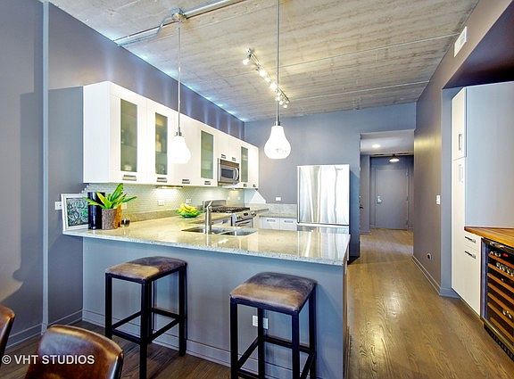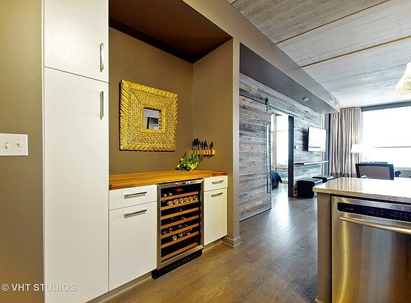 Newly updated corner 2 bedroom + den, 2 bath concrete loft in the most popular building on Sheridan Rd. Refinished dark hardwood floors throughout including the redesigned kitchen with Italian cabinets, SS appliances, granite countertops, glass backsplash, pantry & wine fridge. There is an east facing corner balcony off the living room with designer window treatments, plus a high-design wood accent wall with a custom sliding barn door to the master bedroom. The master suite was redesigned to increase the size of the walk-through closet. Additional custom wood walls line the hall masking the closet, utility room & bathroom doors. The den completely opens up with smoked sliding glass doors that run the length of the room. The 2nd bedroom is a legitimate bedroom with north facing views. New lighting, W/D and heated garage parking completes this unique home. Strong association with strong reserves. Walk to el, the shops in Andersonville or jump on LSD a block away. A must see.