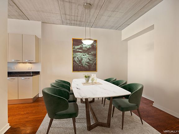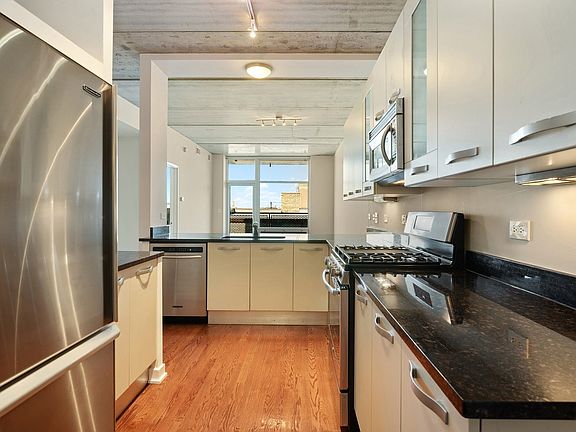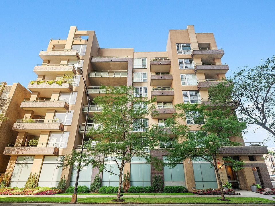 Bright, southwest corner unit clearing the buildings to the west and south allowing for magnificent city views from the floor to ceiling windows. Best floor plan in building with separate dining or family room. Full concrete surround and 10' ceiling. Beautiful kitchen with granite counters, custom European ecru cabinets and stainless steel appliances. Master bath with large vanity, granite counters, soaker tub and shower combination. Hardwood flooring in main living spaces and newly carpeted bedrooms. In-unit washer and dryer located in a large storage room, two walk-in closets and heated, garage parking complete this unit. Building is impeccably maintained and features an elevator, dog run with new K9 Turf, Amazon Hub for packages, newly painted and carpeted common areas and green roof deck with lake views. Steps to shopping, restaurants, transportation, lake, and parks.