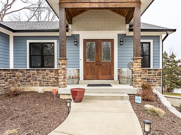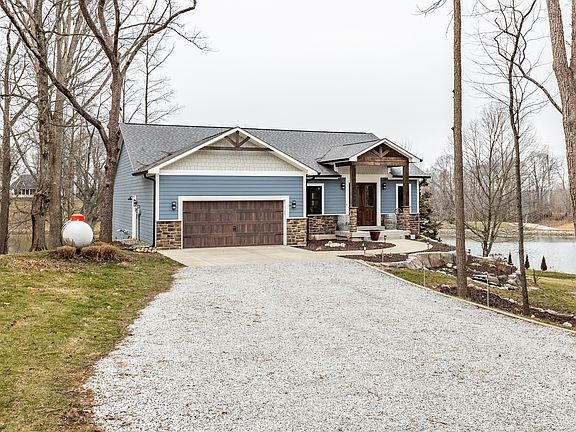 Situated on a private, wooded lot with breathtaking views of Lake Haven, this property provides a peaceful escape. Custom built in 2018, captivating Craftsman architecture, thoughtful design to capture the lake views from nearly every room! 9' sliders off the living room to the covered balcony yearns for morning coffee, work from home life, and entertaining guests. On nearly 1 acre the outdoor hardscaping & landscaping is perfection! Fire up the included waterside grill and dine at the patio before catching the sun set from the boardwalk. Cast a fishing line, launch a kayak or ease into the water - the zero entry is ideal for young swimmers. With trolling motors only the peaceful lake is the quintessential escape. The interior design offers an open floorplan, bamboo floors, 2 fireplaces, a main level primary suite with a 10 x 9 closet, spacious laundry rm & oversized garage with epoxy floors! The showstopper kitchen offers granite counters, tiled backsplash, 2 tone cabinets and 9 x 6 pantry! Retreat to the basement with a 2nd bedroom, 2nd full bath, large family rm (could be converted to add a 3rd bdrm), 2 unfinished areas, wet bar & 2 queen murphy beds (included) for overnight guests. The details here can't be beat from the beautiful 8' leaded glass double front doors to the lighting, custom cabinetry & gardens. Located within 10 minutes of I-70 and 20 minutes to Greenfield shops & eateries.