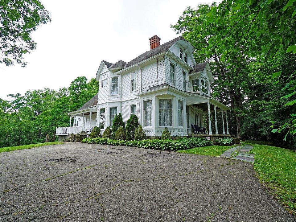 Turn-of-the-century 1890 shingle farmhouse high atop a hill on 2+ acres, w/side& front porches. 10-ft ceilings 1st flr, updtd kit w s/s appliances & oak cabs, newer 1st flr MBR addition w newer full bath. 9=ft 2nd flr ceilings, gorgeous wood floors, marble fireplace surrounds, Victorian millwork, pastoral setting.